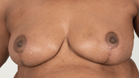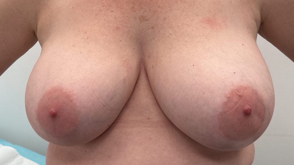 Although she could have had a simple lumpectomy for both sides, she had struggled with large breasts for her whole life, resulting in neck and back pain. She chose to have a bilateral breast reduction (right therapeutic mammoplasty, left symmetrising reduction mammoplasty), whilst removing the malignant changes at the same time.