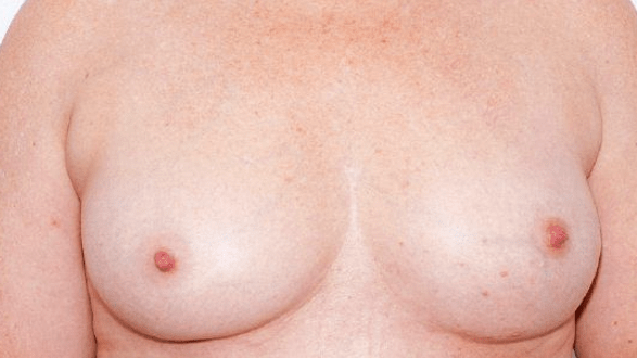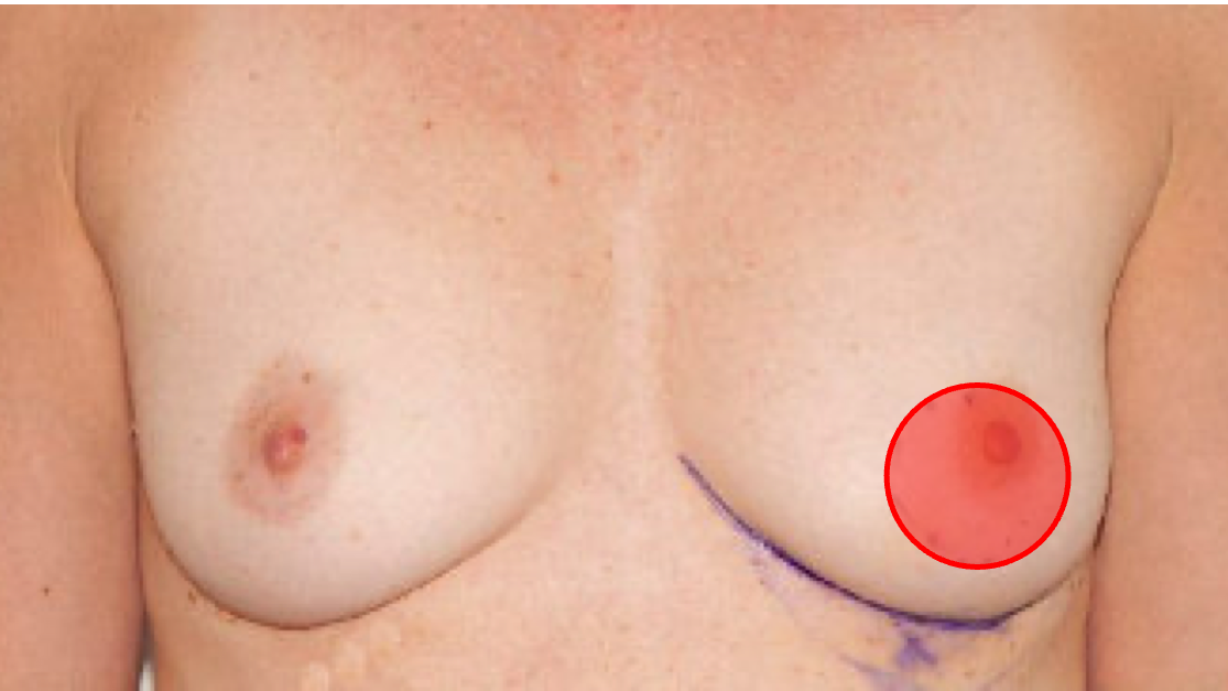This patient had a 35 mm cancer below the nipple (red circle). She had a wide local excision with partial breast reconstruction using a perforator flap (AICAP), and a simultaneous axillary lymph node clearance.
